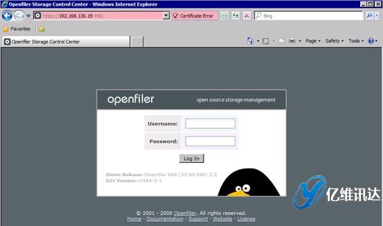 Openfiler 鏡像系統(tǒng)配置當(dāng) Openfiler 系統(tǒng)安裝并重啟完成后,對(duì)系統(tǒng)所有后續(xù)的配置過程,都是以 Web 方式配置完成的。這種全部基于 Web 的系統(tǒng)配置方式,使得配置過程變得更加簡(jiǎn)易,同時(shí)也帶來了良好的用戶體驗(yàn)。首先打開瀏覽器,輸入地址:https://IP:446。注意,此處輸入的 IP 地址為在系統(tǒng)安裝時(shí)所配置的固定 IP 地址。然后使用系統(tǒng)初始默認(rèn)的用戶名和密碼進(jìn)行登陸。用戶名為 openfiler,密碼為 password。系統(tǒng)初始的用戶名和密碼可以在第一次登入系統(tǒng)后進(jìn)行重新設(shè)置。如圖所示。